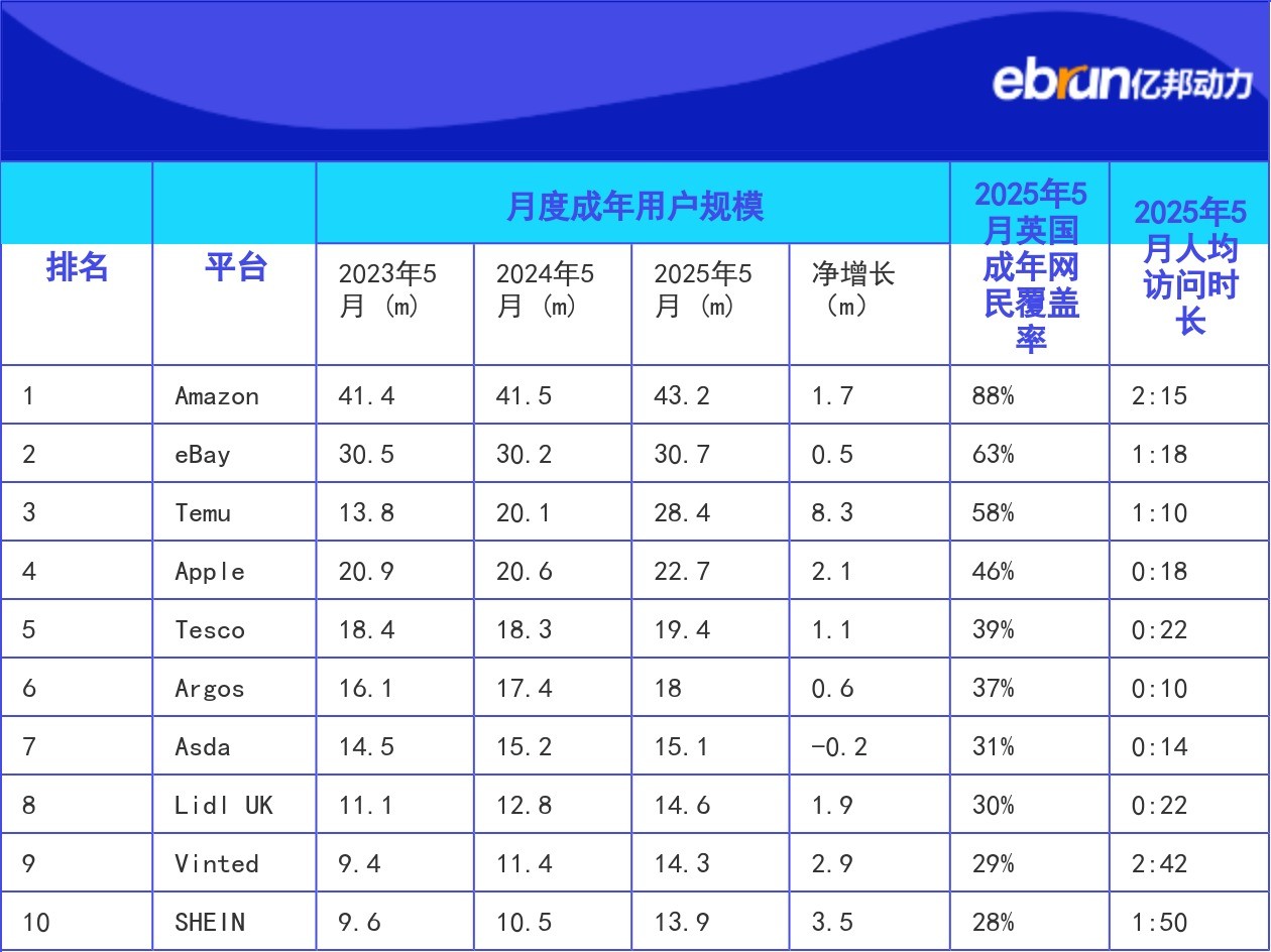 Data from Ipsos iris online audience measurement service shows that Temu's monthly traffic reached 28.4 million visits in May this year, only slightly lower than eBay's 30.7 million visits, with the gap narrowing further. Amazon remained at the top with 43.2 million monthly visits. From a trend perspective, Temu has for the first time demonstrated the realistic potential to challenge eBay's long-standing second-place position in the UK market.