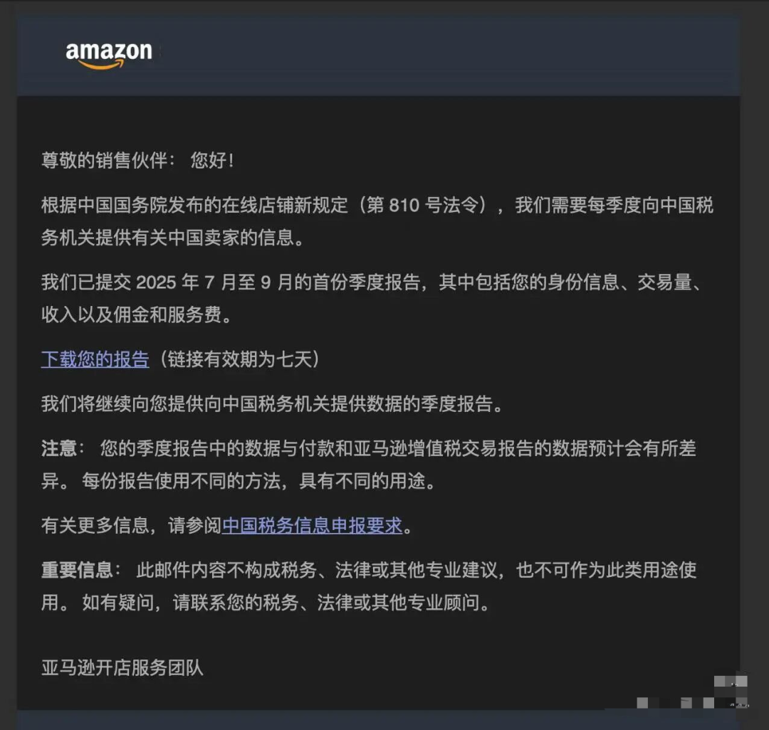 The email stated that, in accordance with China's State Council regulations for online stores (Decree No. 810), platforms are required to provide information about Chinese sellers to Chinese tax authorities on a quarterly basis. The email clarified that Amazon has submitted its first quarterly report for July to September 2025 and provided sellers with a download link for the report.