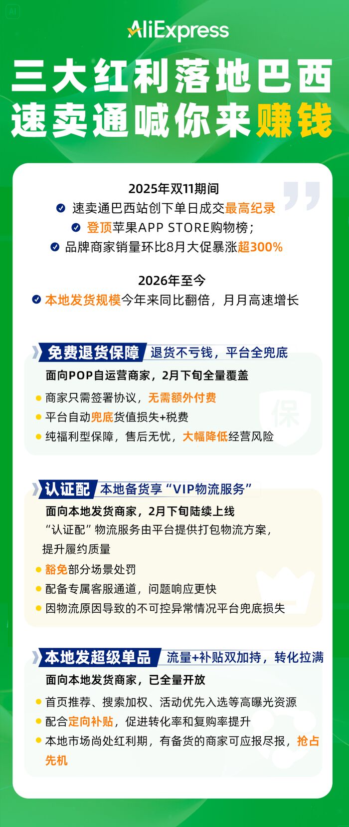 First is the free return protection service. Addressing the relatively high cost of returns in Brazil, AliExpress has introduced a 'Free Return Protection' service for cross-border merchants operating independently on the platform: merchants only need to sign an agreement without additional fees, and the platform will automatically cover losses from product value and taxes incurred during returns. Currently, the return protection service in Brazil is being rolled out in batches and is expected to achieve full coverage by late February.