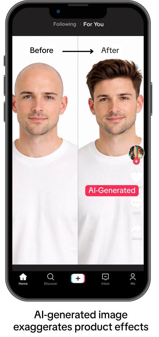 Merchants must not use AI, filters, or editing tools to fabricate 'after-use effects' on real people or AI avatars – this is particularly sensitive in health and beauty product categories.